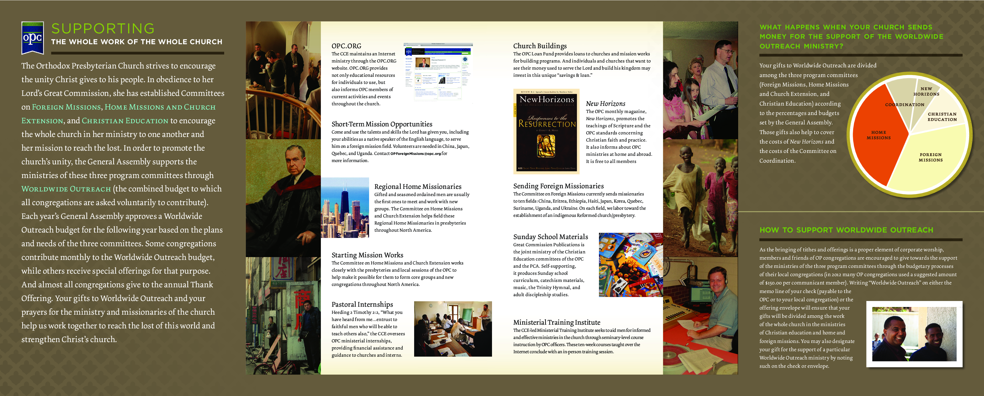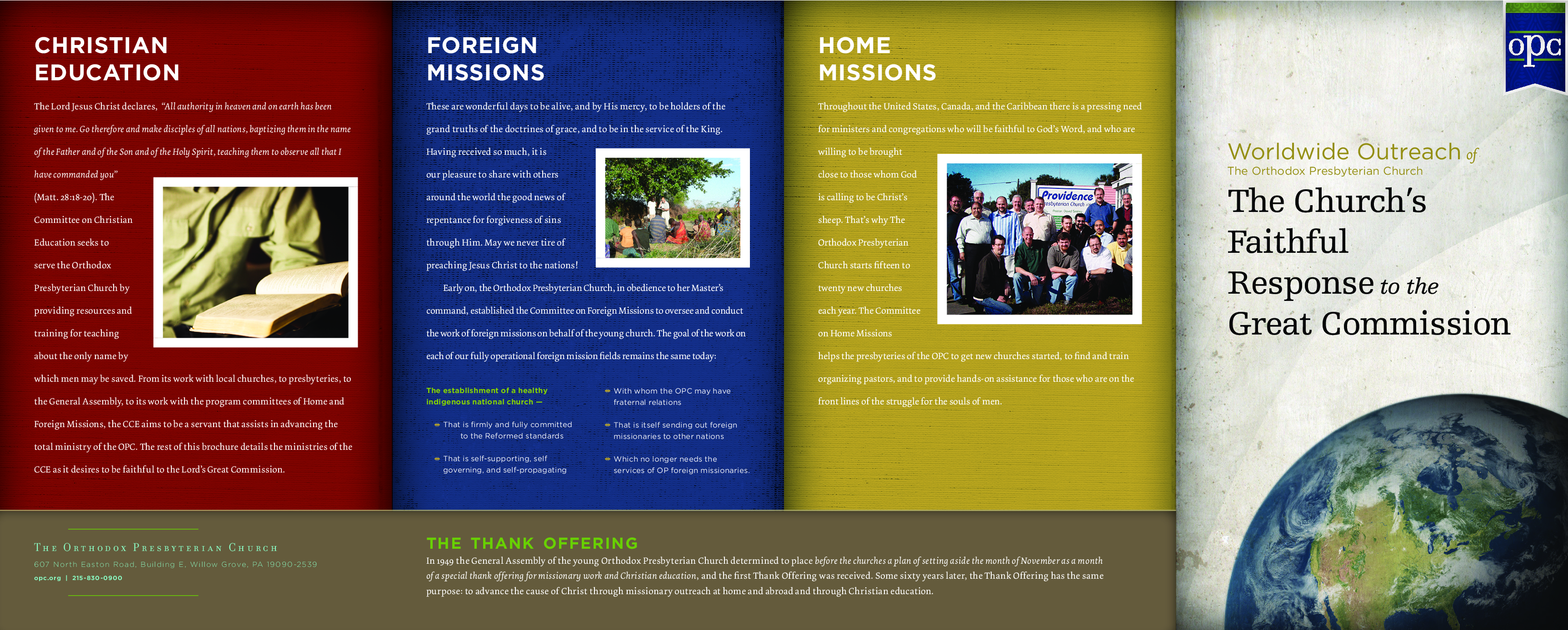 Worldwide Outreach refers to the united effort in the Church to serve God faithfully in the areas of Christian Education, Foreign Missions and Home Missions. The goals, plans and budgets of these respective "program" committees are brought together through the Committee on Coordination and presented in a unified fashion to the General Assembly. After the General Assembly does its work of review, correction and finally approval, the Worldwide Outreach Program is commended to OP churches and members (and also OP friends) for their prayer and monetary support. Having received the General Assembly-approved budget for Worldwide Outreach, the local OPC churches give accordingly to fund the work of the program committees.