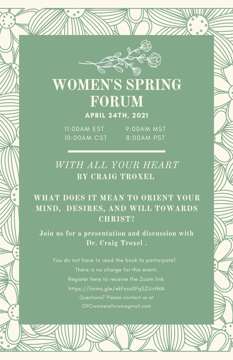 What does it mean to orient your mind, desires and will towards Christ? You are invited to attend a Women’s Spring Forum with Dr. Craig Troxel, OPC minister and author of the new book With All Your Heart. There will be a presentation followed by small group discussions. Register for this free event to receive the Zoom link.