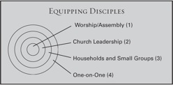 In our day, there's an emphasis on private, one-on-one discipleship training (the outer circle in the diagram below). As another form of equipping, we might meet at the local coffee shop to discuss parenting issues or gather in small groups for Bible studies (circle 2 or 3 in the diagram). Such gatherings are important, but the Lord specially visits his people in worship for receiving and acting on his words (Heb. 12:25). To neglect worship is to neglect needful discipleship (Heb. 10:25). We're on solid ground to say that worship is the gold mine; it provides the model that is to influence other gatherings. The book of Proverbs, the widely accepted manual on parenting and covenant nurture, says: "The fear of the Lord is the beginning of wisdom." Covenant nurture starts by fearing God in worship.