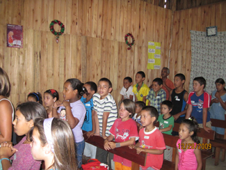 Things wouldn't have run as smoothly as they did unless there was a coordinator before, during, and even after the missions trip. That part was played by my wife, Jane, who did just a marvelous job. To God be the glory! Towards the end of our stay, she met with a member of the local church who heads up the ministry to children at the mission work, a gifted lady named Cristina (Brazilian by birth and bilingual). She accompanies the singing by playing the keyboard, and she teaches the children. Jon Falk asked if Jane could sit down with Cristina to give her a few pointers on how to hold the children's attention while teaching the material (we used the Children's Catechism published by Children's Ministry International and left it with them for further use), and Cristina did a fine job of teaching on our last day together! Kathleen wrote out the musical score to the Bible books memory songs, and Cristina led the children on the keyboard as they sang it on our last day together.